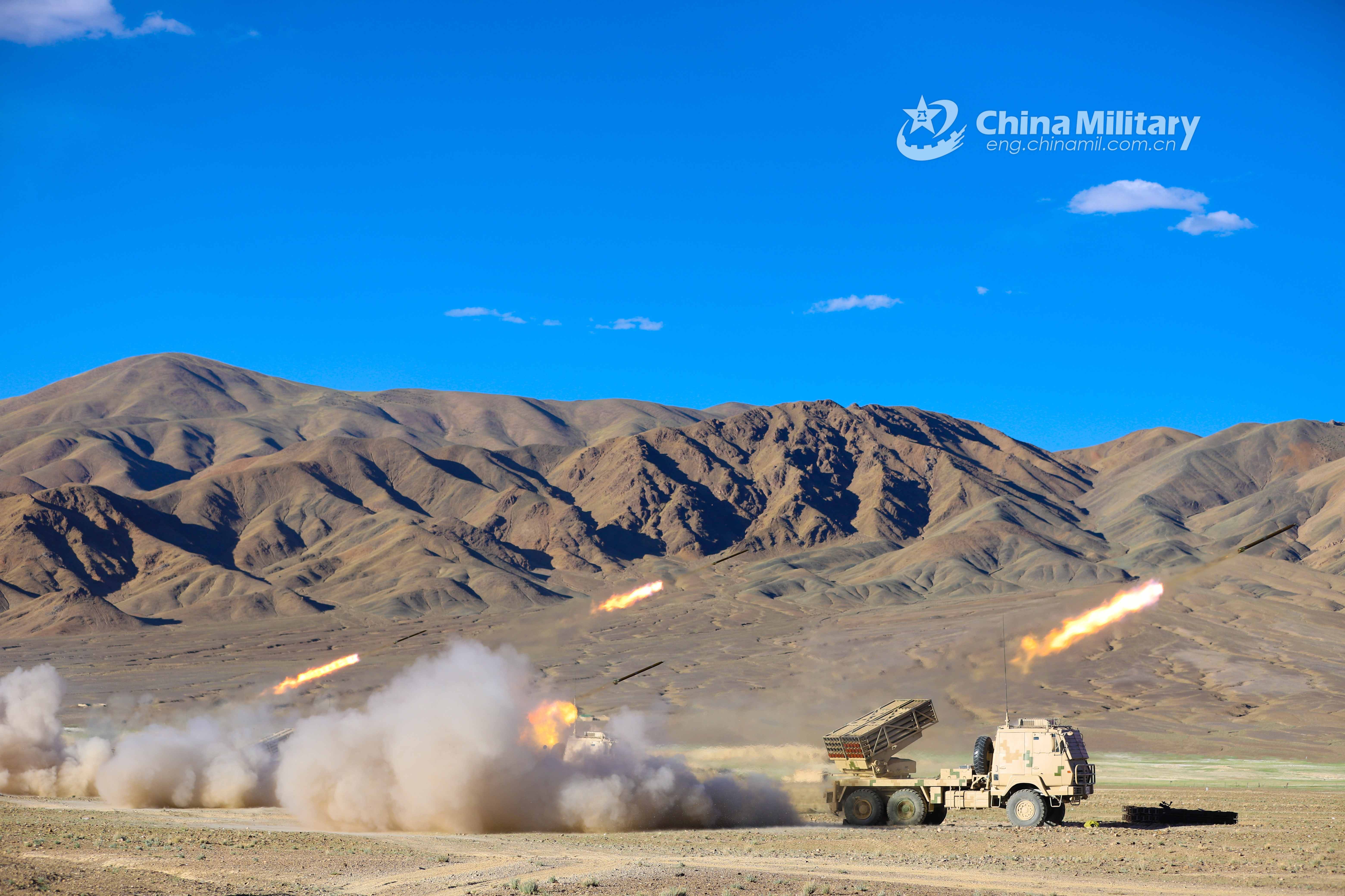 Truck-mounted long-range multiple launch rocket systems (LRMLRS) attached to an artillery detachment with a regiment under the PLA Army fire rockets at mock ground targets during a live-fire test in July of 2021. (eng.chinamil.com.cn/Photo by Xiang Xudong)