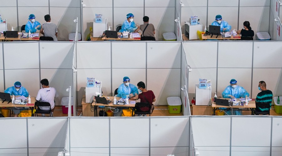 Residents get inoculated against the COVID-19 virus at a vaccination site in a stadium in Nanjing of east China's Jiangsu Province, Aug. 2, 2021. (Xinhua/Li Bo)