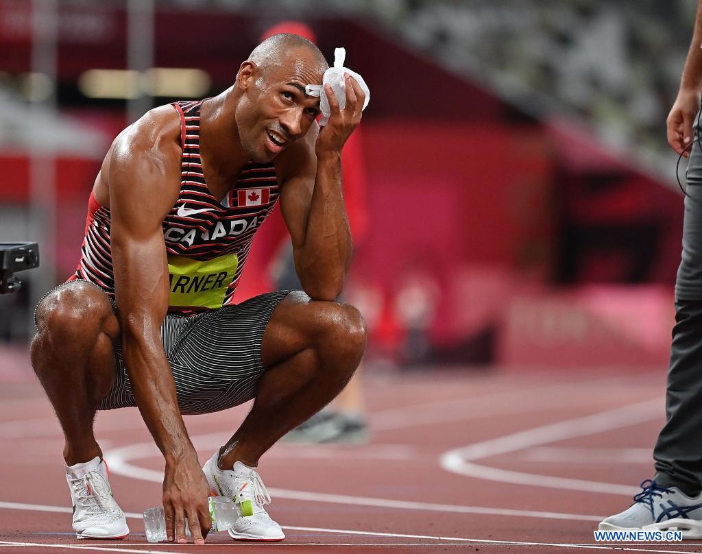 Damian Warner of Canada reacts after the Men's Decathlon 1500m at the Tokyo 2020 Olympic Games in Tokyo, Japan, Aug. 5, 2021. (Xinhua/Jia Yuchen)