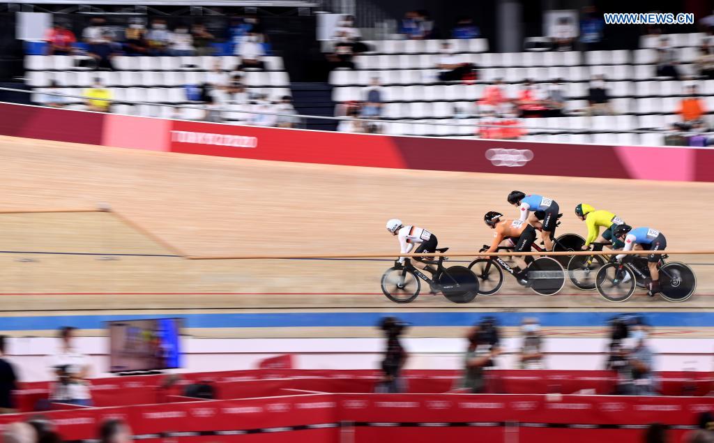Cyclists compete during the cycling track women's keirin final at Tokyo 2020 Olympic Games, in Izu, Japan, Aug. 5, 2021. (Xinhua/Zhang Hongxiang)