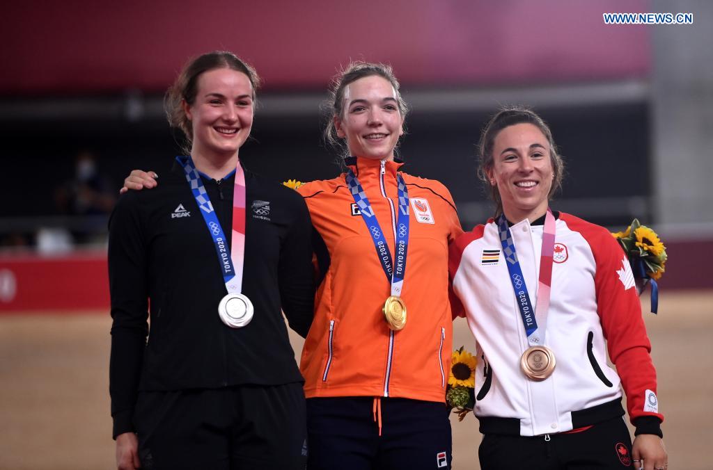 Gold medalist Shanne Braspennincx (C) of the Netherlands, Silver medalist Ellesse Andrews (L) of New Zealand and Bronze medalist Lauriane Genest of Canada pose at the awarding ceremony after cycling track women's keirin final at Tokyo 2020 Olympic Games, in Izu, Japan, Aug. 5, 2021. (Xinhua/Zhang Hongxiang)