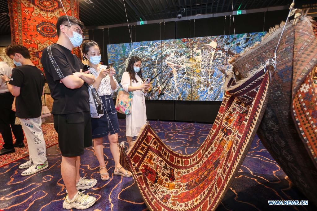Visitors take photos of carpets at an exhibition showcasing carpet art in east China's Shanghai Aug. 3, 2021. (Xinhua/Wang Xiang)