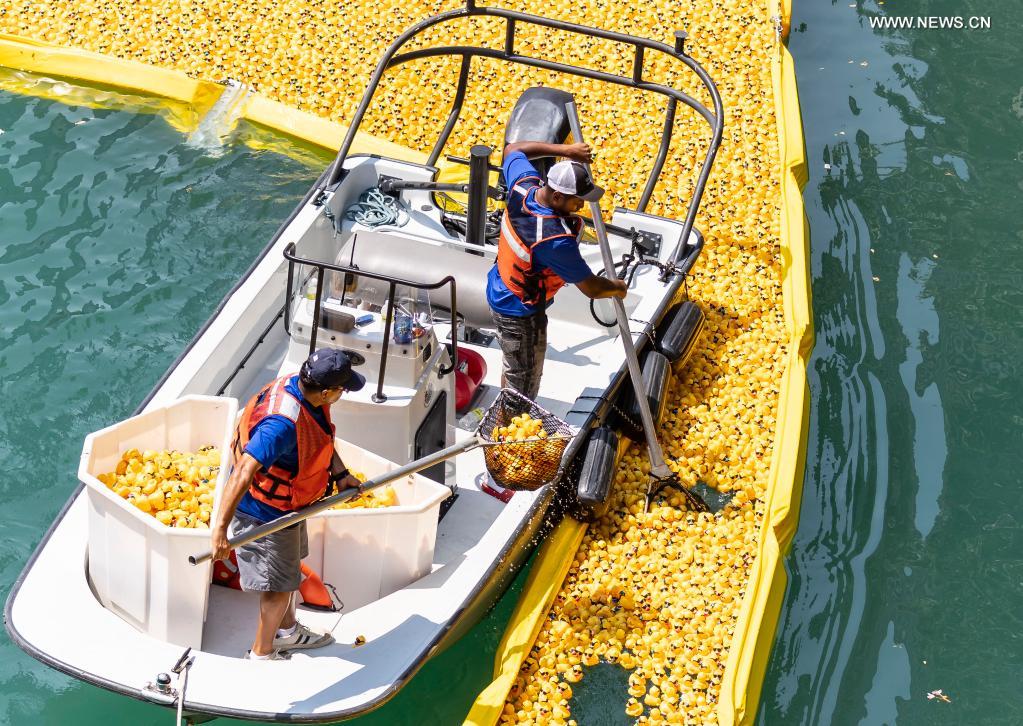 Yellow rubber ducks are taken out of the Chicago River in downtown Chicago, the United States, on Aug. 5, 2021. The 2021 Chicago Ducky Derby on Thursday dumped 70,000 rubber ducks into the Chicago River to raise funds for the Special Olympics Illinois. (Photo by Joel Lerner/Xinhua)