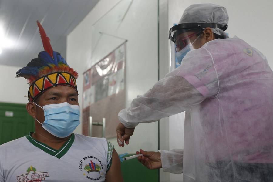 A man receives a dose of China's COVID-19 vaccine in the city of Tabatinga in the state of Amazonas, Brazil, Jan. 19, 2021. (Photo by Lucio Tavora/Xinhua)