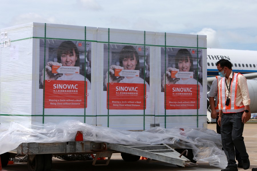 A batch of China's Sinovac COVID-19 vaccines arrives at the Phnom Penh International Airport in Phnom Penh, Cambodia, July 31, 2021. (Photo by Ly Lay/Xinhua)
