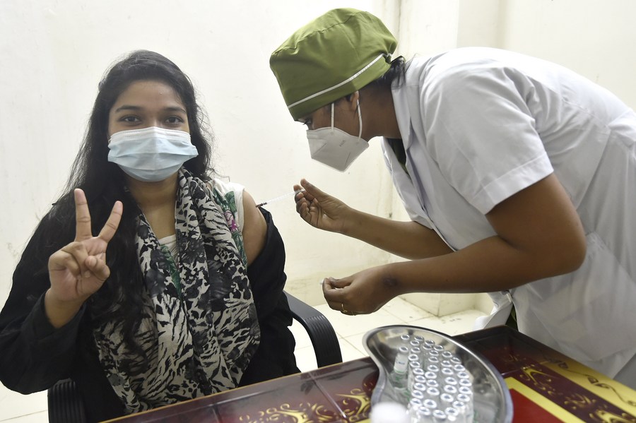 A medical worker inoculates a woman with a dose of China's Sinopharm COVID-19 vaccine in Dhaka, Bangladesh, June 19, 2021. (Xinhua)