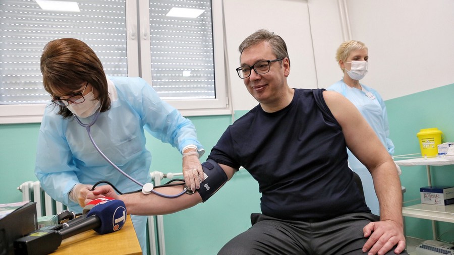 Serbian President Aleksandar Vucic checks blood pressure before receiving the second dose of the Chinese Sinopharm vaccine in Doljevac, Serbia, April 27, 2021. (Photo by Wang Wei/Xinhua)