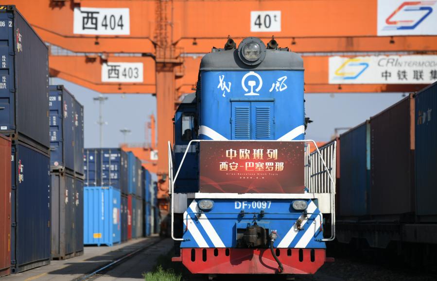 A China-Europe freight train bound for Barcelona of Spain waits for departure in Xi'an, northwest China's Shaanxi Province, April 8, 2020. (Xinhua/Li Yibo)