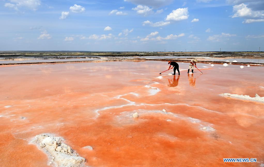 Salt factory employees work at a salt lake in Dingbian County, northwest China's Shaanxi Province, Aug. 7, 2021. (Xinhua/Tao Ming)