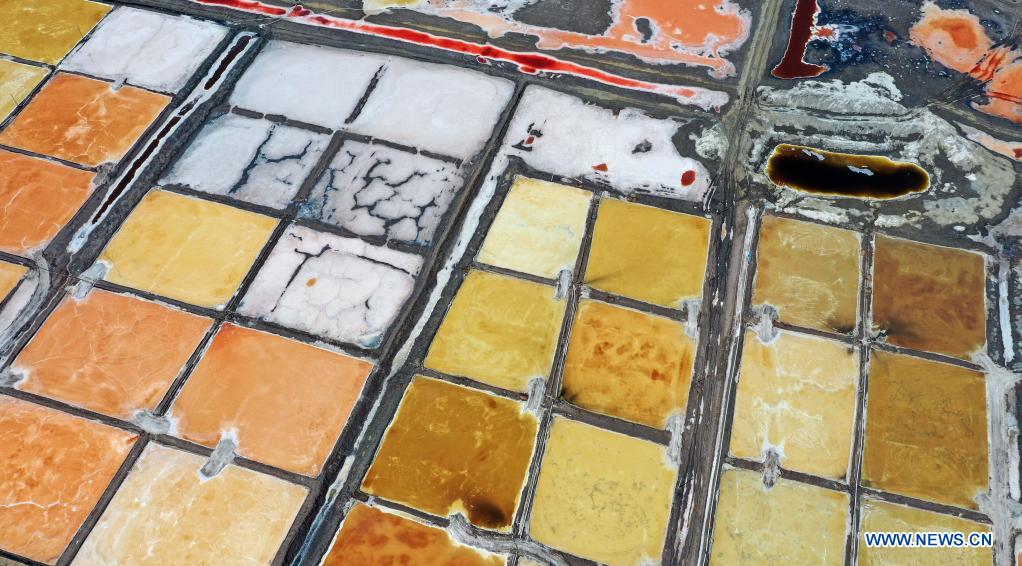 Aerial photo taken on Aug. 7, 2021 shows salt lakes in Dingbian County, northwest China's Shaanxi Province. (Xinhua/Tao Ming)