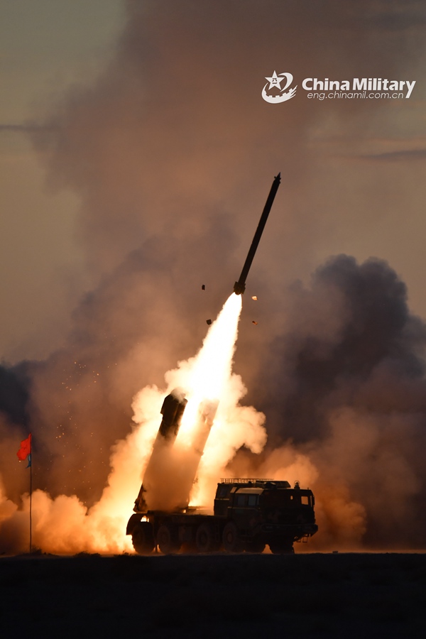 A PHL-03 long-range multiple launch rocket system (LRMLRS) attached to an artillery brigade under the PLA 74th Group Army fires rockets at simulate target during a night raid exercise in an undisclosed desert area of northwest China on July 28, 2021. (eng.chinamil.com.cn/Photo by Huang Hai)
