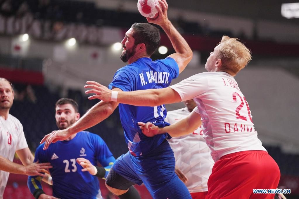 Nikola Karabatic (C) of France competes during the men's handball final between France and Denmark at the Tokyo 2020 Olympic Games in Tokyo, Japan, Aug. 7, 2021. (Xinhua/Fei Maohua)