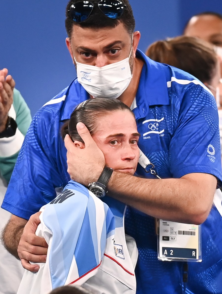 Oksana Chusovitina of Uzbekistan is consoled by her coach after the women's artistic gymnastics qualification round on July 25, 2021. (Xinhua/Cheng Min)