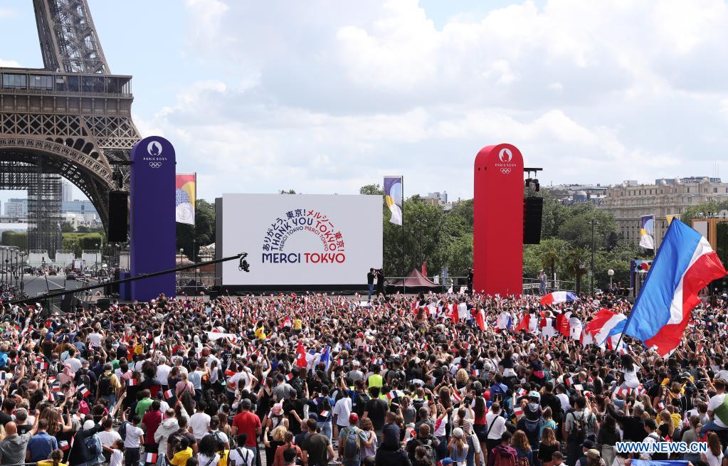 People gather at the Olympics fan zone to watch the closing ceremony of the Tokyo 2020 Olympic Games, in front of the Eiffel Tower, in Paris, France, Aug. 8, 2021. Celebrations were held in Paris Sunday as part of the handover ceremony of Tokyo 2020 to Paris 2024. (Xinhua/Gao Jing)