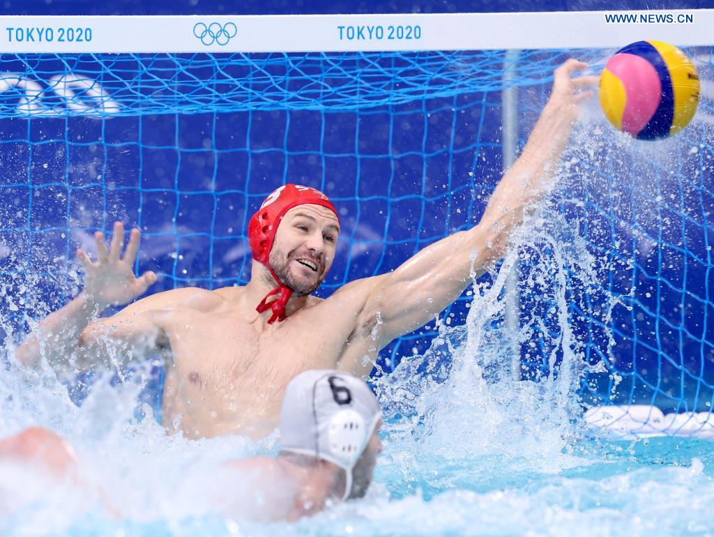 Goalkeeper of Team Serbia Branislav Mitrovic competes during the men's water polo final at Tokyo 2020 Olympic Games, in Tokyo, Japan, Aug. 8, 2021. (Xinhua/Chen Jianli)