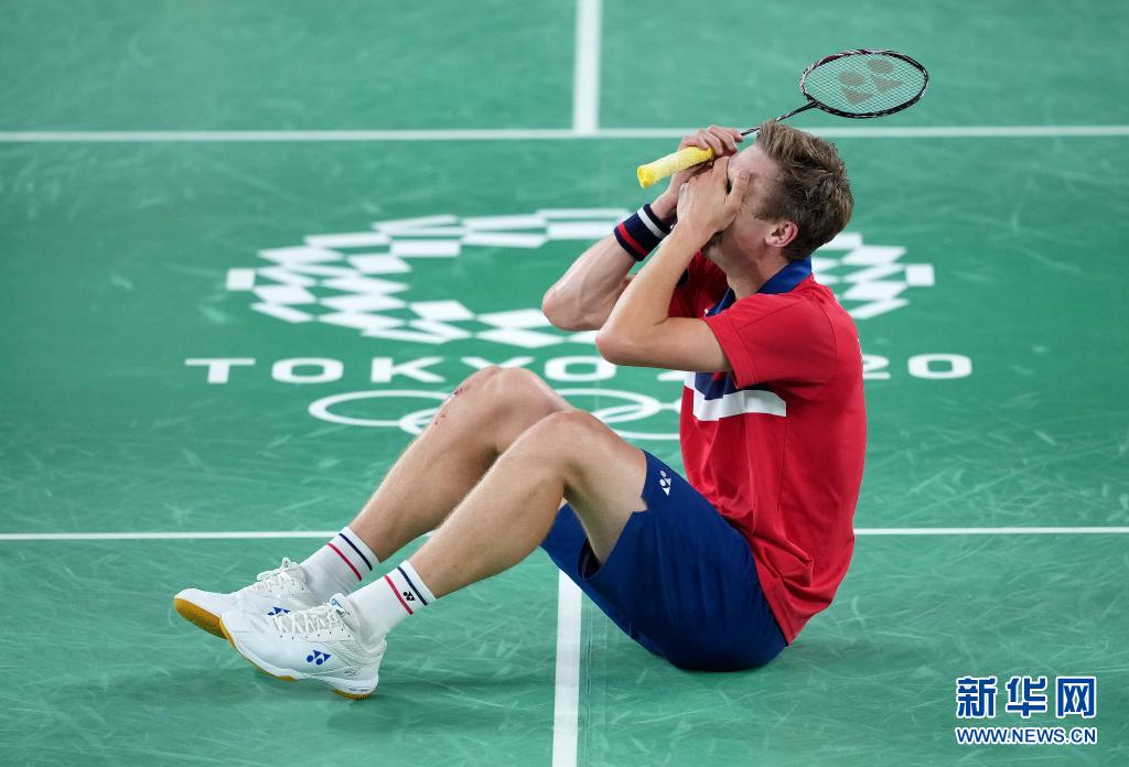 Viktor Axelsen of Denmark reacts after winning the Tokyo Olympics badminton men's singles gold medal on Aug. 2, 2021. (Xinhua/Xue Yubin)