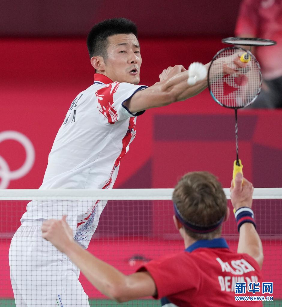 Chen Long of China competes against Viktor Axelsen in the Tokyo Olympics badminton men's singles gold medal final match in Tokyo, Aug. 2, 2021. (Xinhua/Xue Yubin)