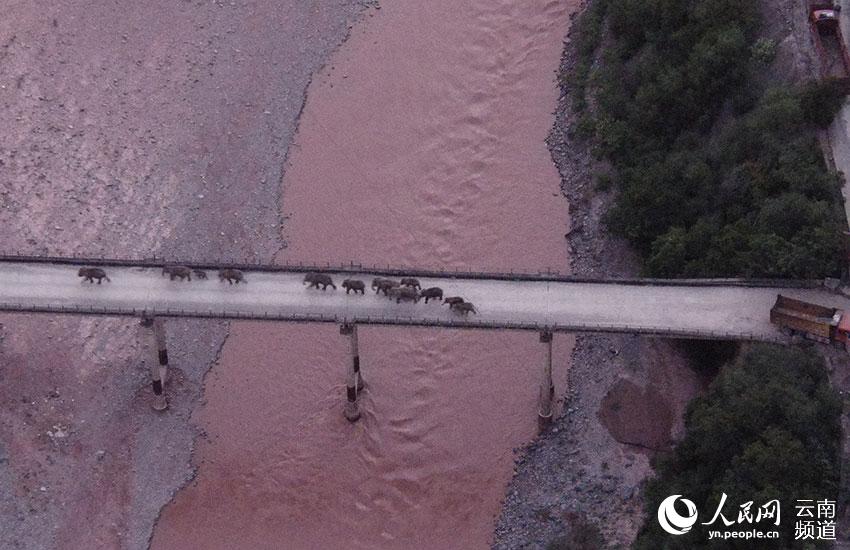 Photo shows the herd of wild Asian elephants crossing the Yuanjiang bridge over the Yuanjiang River in Yuanjiang county, Yuxi city, southwest China’s Yunnan province. (Photo courtesy of Yunnan Forest Fire Brigade)
