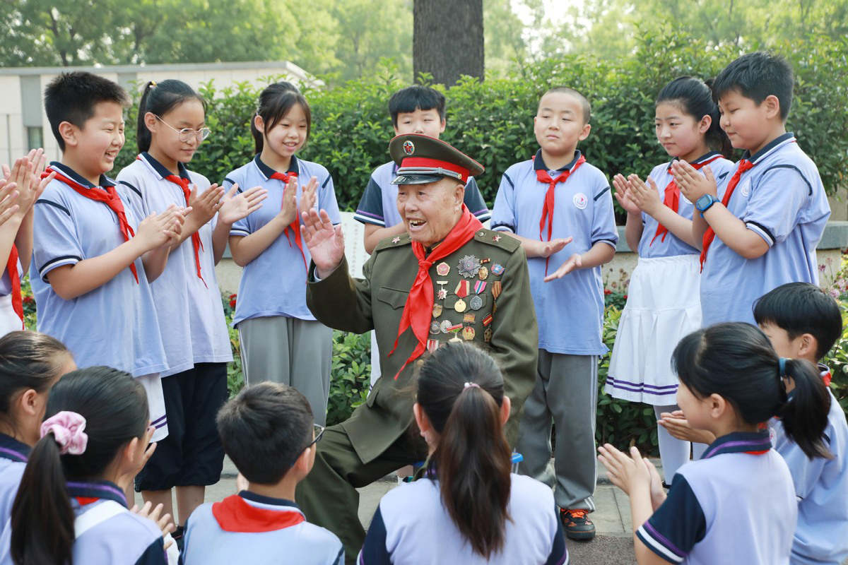 Wang Zhanshan tells his stories to students from Sanguanmiao Primary School in Anyang city, Henan province, on June 11. (Photo/Xinhua)