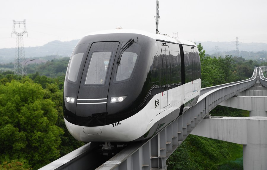 Photo taken on April 16, 2021 shows a SkyShuttle running on rails in Bishan District, southwest China's Chongqing Municipality. The SkyShuttle was developed by China's new-energy vehicle manufacturer BYD. (Xinhua/Wang Quanchao)