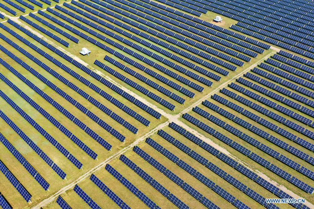 Aerial photo taken on Aug. 4, 2021 shows a photovoltaic power station in Tujing Village, Yunzhou District of Datong City, north China's Shanxi Province. The photovoltaic power station, built upon 1,851 mu (123.4 hectares) of saline-alkaline land, generates over 80 million KWH of power per year. (Xinhua/Cao Yang)