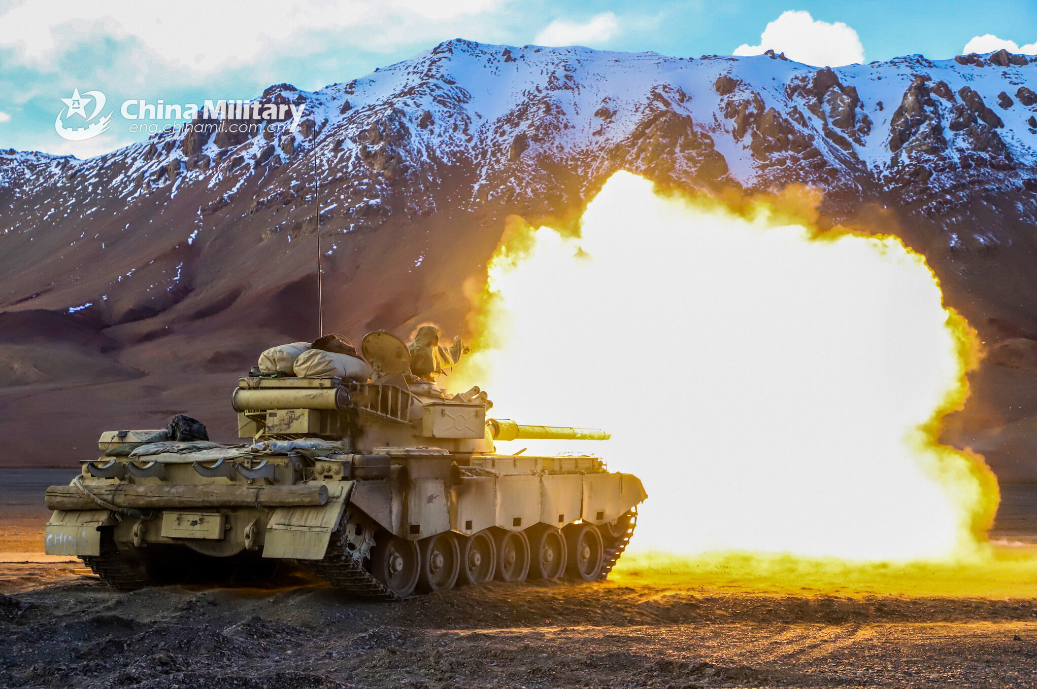 A main battle tank attached to a tank detachment with a PLA Army regiment fires its main gun at a simulated target during a recent live-fire training exercise in Gobi desert. (eng.chinamil.com.cn/Photo by Shi Jinguang)