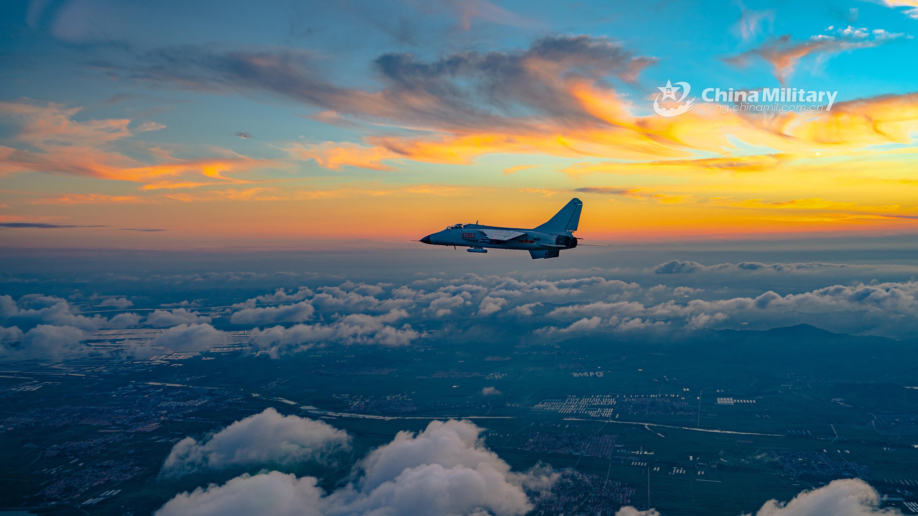 A fighter bomber attached to a naval aviation brigade under the PLA Northern Theater Command pierces into the stratosphere through clouds and mist during a round-the-clock flight training exercise in late July. (eng.chinamil.com.cn/Photo by Li Mingxi and Liu Xuhong)