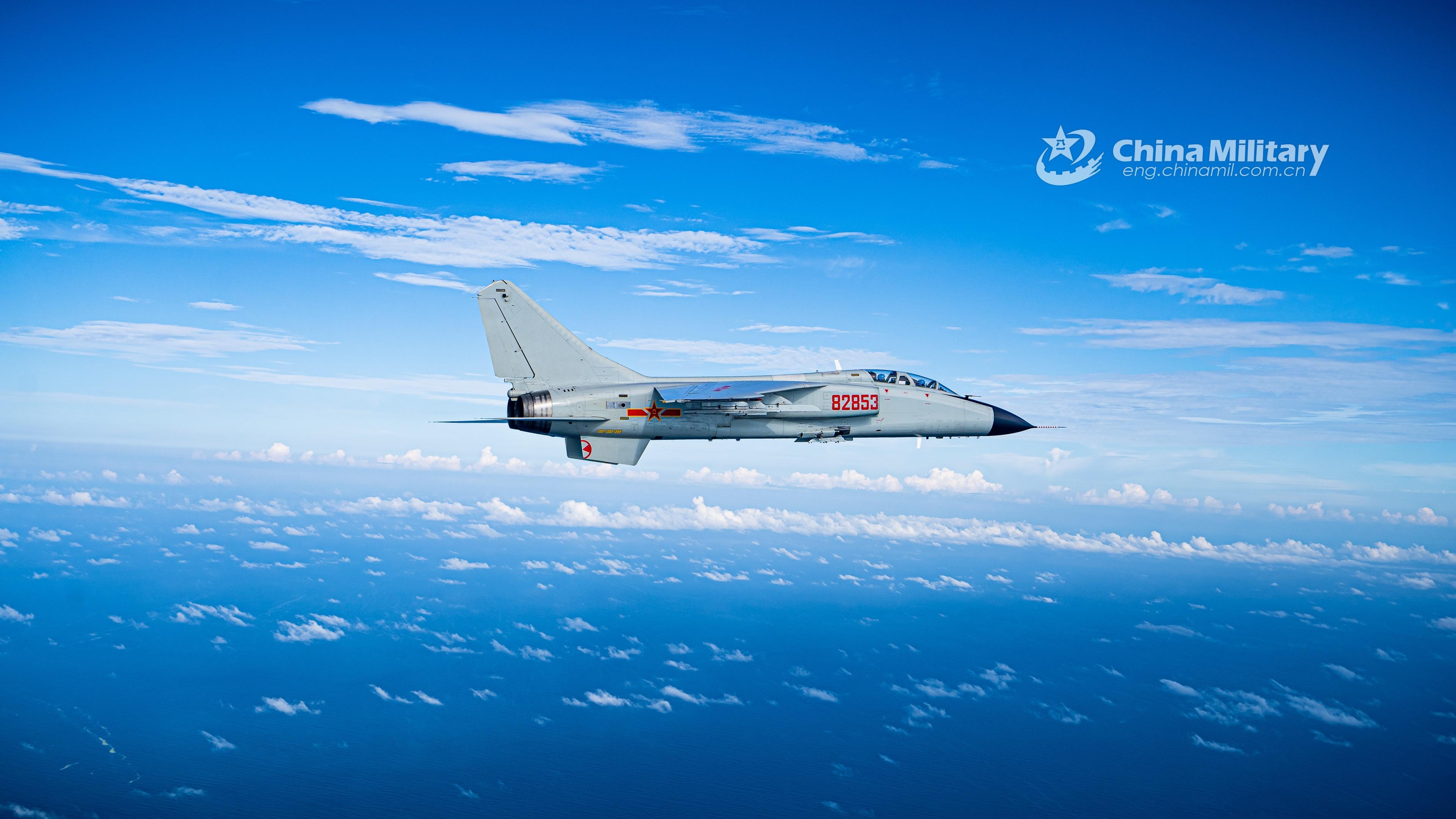 A fighter bomber attached to a naval aviation brigade under the PLA Northern Theater Command pierces into the stratosphere through clouds and mist during a round-the-clock flight training exercise in late July. (eng.chinamil.com.cn/Photo by Li Mingxi and Liu Xuhong)
