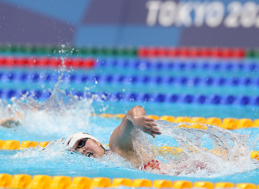 Li Bingjie on her way to setting a new Asian record during the women's 400m freestyle heat at Tokyo 2020 on July 25, 2021. (Xinhua/Ding Xu)