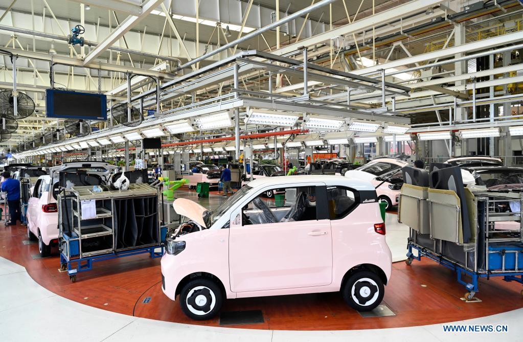 Staff members work on the production line of new energy vehicle at an automobile company in Liuzhou, south China's Guangxi Zhuang Autonomous Region, Aug. 12, 2021. Liuzhou City has seen 199 thousand new energy vehicles sold from January to June in 2021. The city has been implementing measures to encourage research and development (R&D) and promote production capacity in a bid to boost its new energy automobile industry in recent years. (Photo by Li Hanchi/Xinhua)