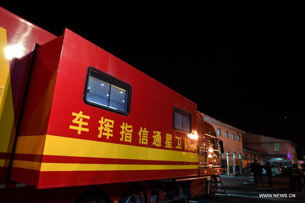 A satellite communication command vehicle is seen at the entrance of a coal mine in Haibei Tibetan Autonomous Prefecture, northwest China's Qinghai Province, Aug. 14, 2021. China's Ministry of Emergency Management has sent a work team to the northwest province of Qinghai to guide rescue efforts after a coal mine was flooded by mud on Saturday. Of the 21 miners working in the mine when the accident occurred, two were lifted to the ground, including one who was confirmed dead, while the rest remained trapped, according to the ministry. Rescue operations are underway as more rescuers rushed to the site. (Xinhua/Wu Gang)