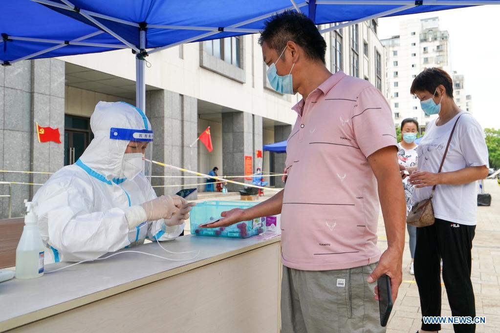 Residents register for nucleic acid tests at a testing site in Yangzhou, east China's Jiangsu Province, Aug. 14, 2021. The city of Yangzhou launched a new round of mass nucleic acid testing in key areas on Saturday. (Xinhua/Li Bo)