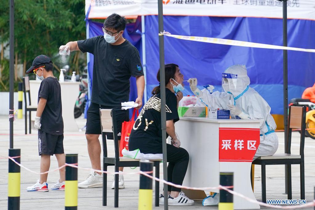 A medical worker takes a throat swab sample from a woman at a nucleic acid testing site in Yangzhou, east China's Jiangsu Province, Aug. 14, 2021. The city of Yangzhou launched a new round of mass nucleic acid testing in key areas on Saturday. (Xinhua/Li Bo)