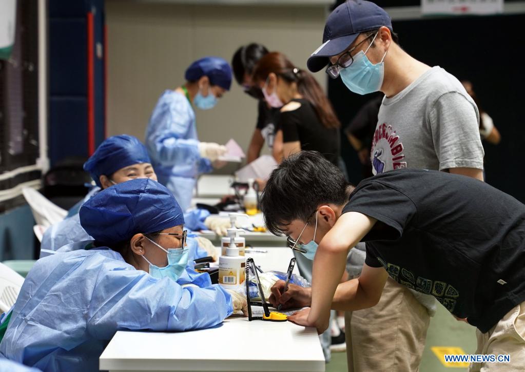 Teenagers sign up before vaccination at a vaccination point in Shanghai, east China, Aug. 14, 2021. Shanghai started vaccinating teenagers aged between 15 and 17 against the COVID-19 on Saturday. (Xinhua/Liu Ying)