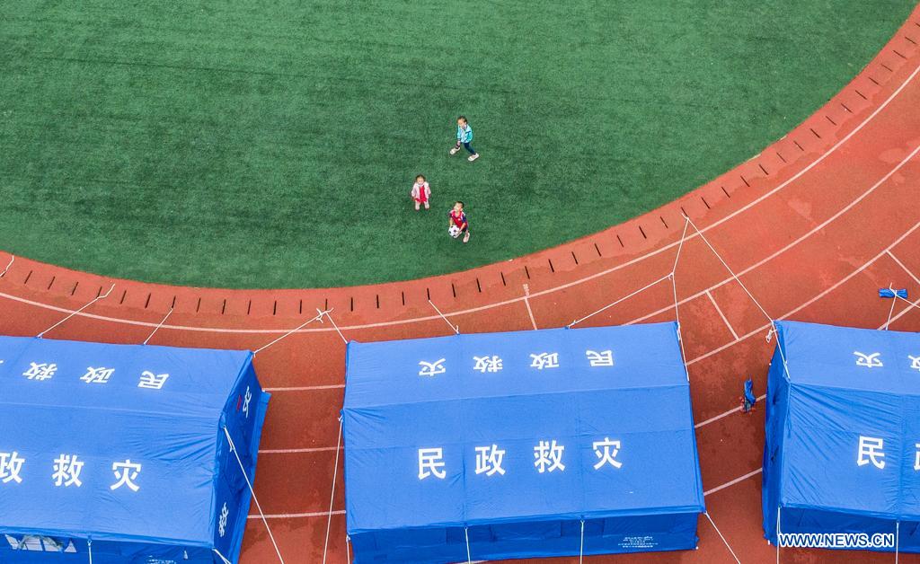 Aerial photo taken on Aug. 14, 2021 shows children playing soccer at a temporary shelter on the playground of a school in Liulin Township in Suizhou, central China's Hubei Province. Over 8,000 people have been affected in the township hit by heavy rainfall. (Photo by Wu Zhizun/Xinhua)