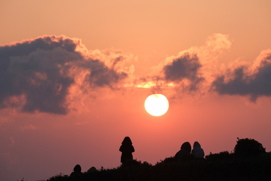 Tourists watch sunrise on the Wumeng grassland in Liupanshui City in southwest China's Guizhou Province on May 3, 2021. People enjoy outdoor activities during the five-day May Day holiday across China. (Photo by Ye Yikun/Xinhua)
