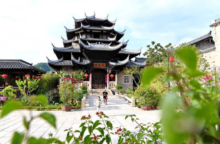 Children play near the Wenchang Pavilion in Tingzhou Town of Changting County, east China's Fujian Province, Aug. 20, 2020. Changting County has been maintained in accordance with its ancient appearance to best demonstrate its history and culture. (Xinhua/Lin Shanchuan)