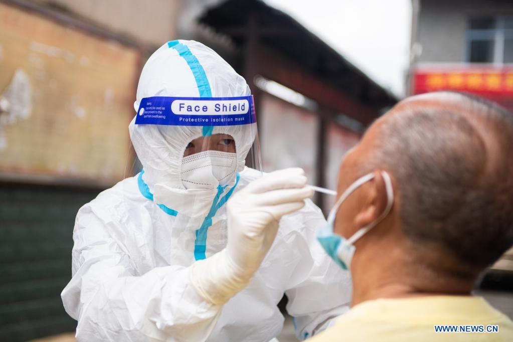 Luo Jinwu takes a throat swab sample from a resident for nucleic acid testing in Yangping Village of Yongding District in Zhangjiajie City, central China's Hunan Province, Aug. 12, 2021. Luo Jinwu and his wife Xiang Ka are medical workers from Zhangjiajie Hospital of Traditional Chinese Medicine. Since the recent resurgence of COVID-19 in Zhangjiajie from July 29, Luo has been conducting nucleic acid tests especially in the countryside, while Xiang has stationed in the hospital to attend to patients. Being apart for about half a month, the couple kept in contact via video link. "Both of us understand the heavy workload we bear at the front line of epidemic prevention and control," Xiang said, hoping the coronavirus resurgence will soon be deterred and they can be reunited. (Xinhua/Chen Sihan)