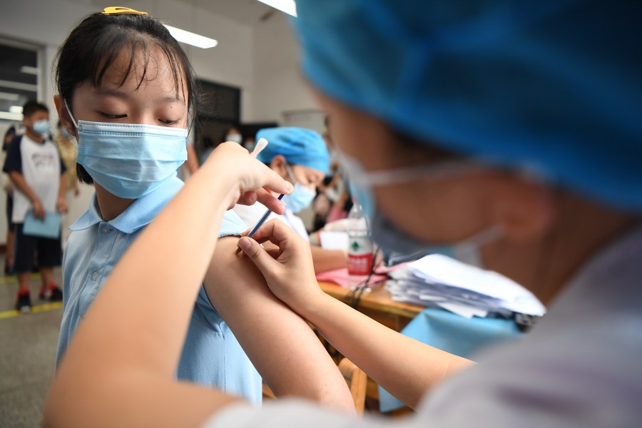 A student gets inoculated against the COVID-19 at a middle school in Changsha, capital city of central China's Hunan Province, Aug. 14, 2021. (Xinhua/Xue Yuge)