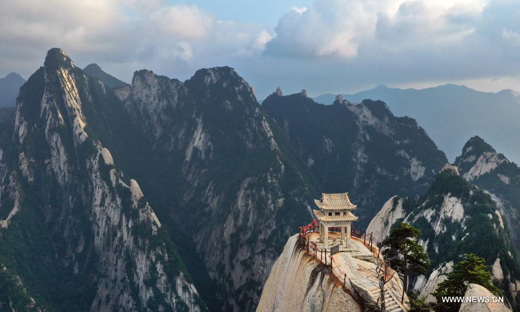Aerial photo taken on Aug. 14, 2021 shows the mist-shrouded Mount Huashan in Weinan City, northwest China's Shaanxi Province. (Xinhua/Tao Ming)