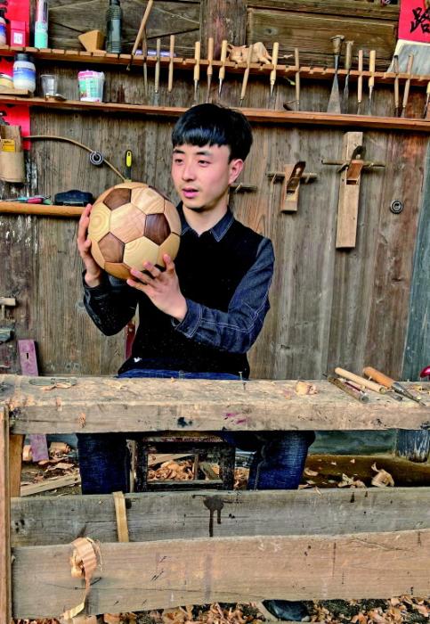 An Xu holds up a wooden football he produced by himself. (Photo courtesy of the interviewee)