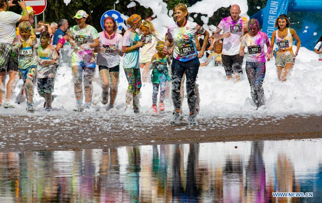 People take part in a color festival in Jurmala, Latvia, on Aug. 15, 2021. (Photo by Edijs Palens/Xinhua)