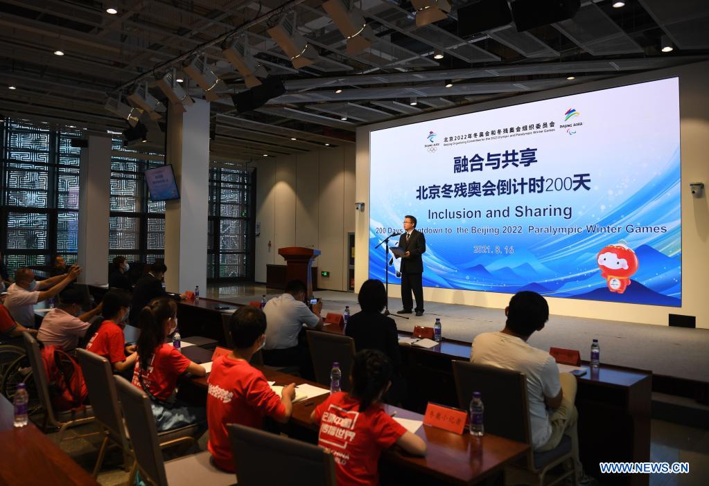 Photo taken on Aug. 16, 2021 shows a ceremony entitled "Inclusion and Sharing" for the 200 days countdown to the Beijing 2022 Paralympic Winter Games in Shougang Park in Beijing, capital of China. (Xinhua/Zhang Chenlin)