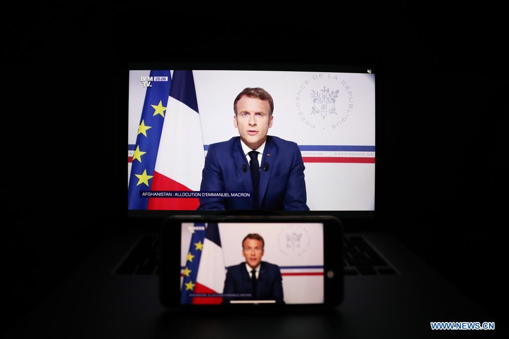 Photo taken on Aug. 16, 2021 shows a live broadcast of French President Emmanuel Macron's televised address in Paris, France. Macron on Monday called for "a responsible and united response" within the United Nations Security Council on Afghanistan, and warned against the risk of irregular migration flows to Europe caused by the destabilization of Afghanistan. (Xinhua/Gao Jing)