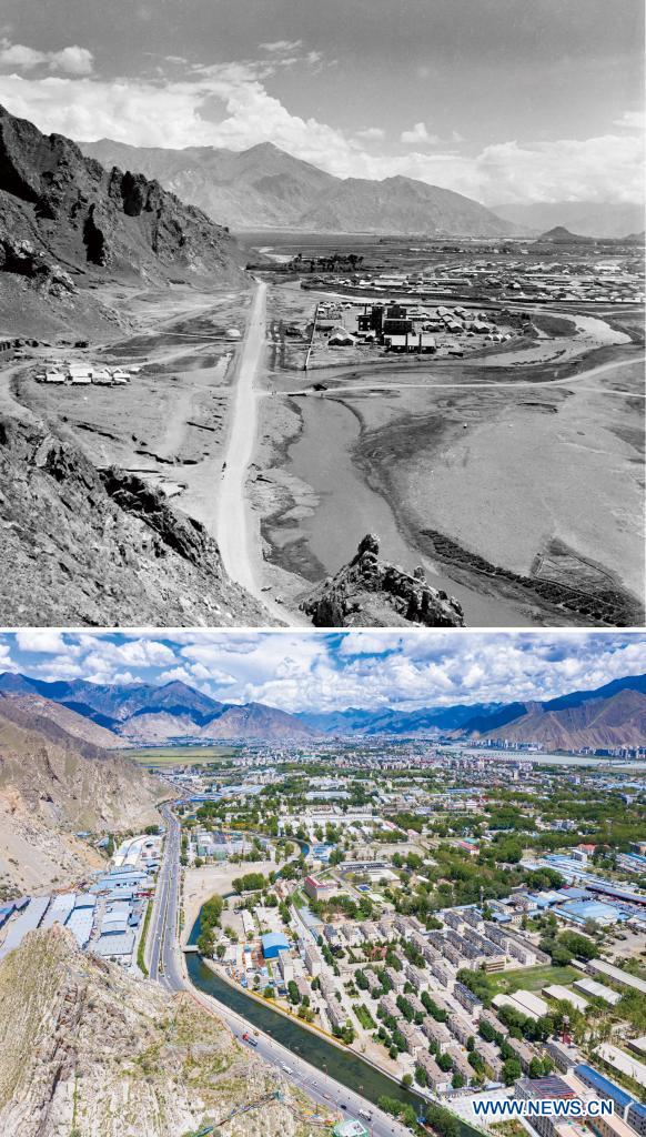 In this combo photo, the upper part taken by Lan Zhigui in the 1960s and the lower part taken by Purbu Zhaxi on Aug. 9, 2021 shows views of the west suburbs of Lhasa, southwest China's Tibet Autonomous Region. On May 23, 1951, the Agreement of the Central People's Government and the Local Government of Tibet on Measures for the Peaceful Liberation of Tibet (17-Article Agreement) was signed, officially proclaiming the peaceful liberation of Tibet. The year 2021 marks the 70th anniversary of the historic event. (Xinhua)