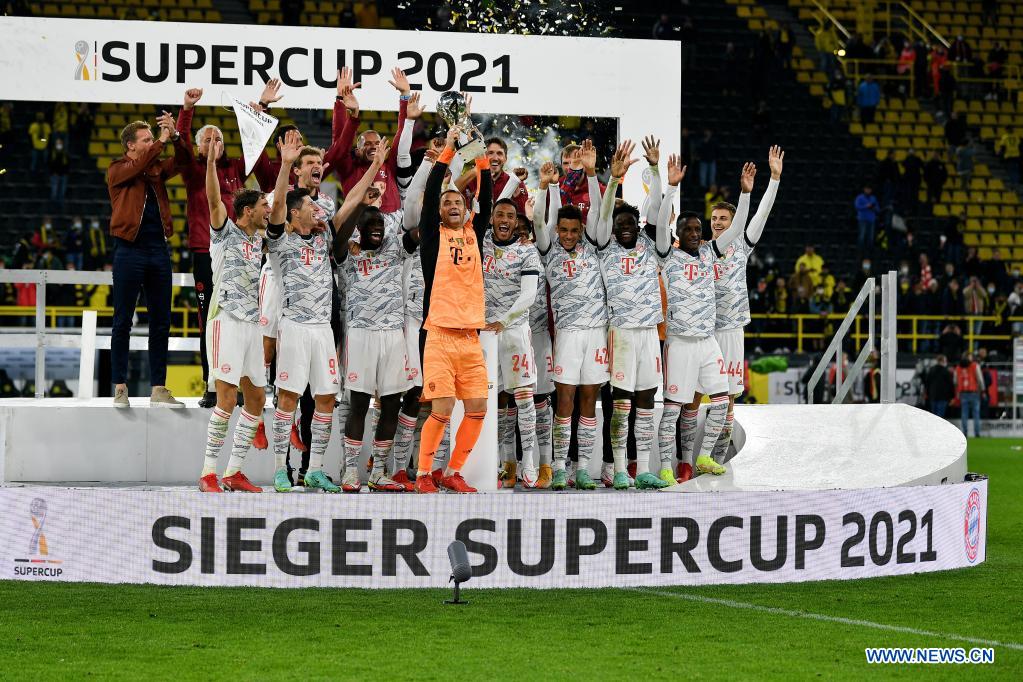 Members of Bayern Munich celebrate during the awarding ceremony after the German Supercup football match between Borussia Dortmund and FC Bayern Munich in Dortmund, Germany, Aug. 17, 2021. (Photo by Ulrich Hufnagel/Xinhua)