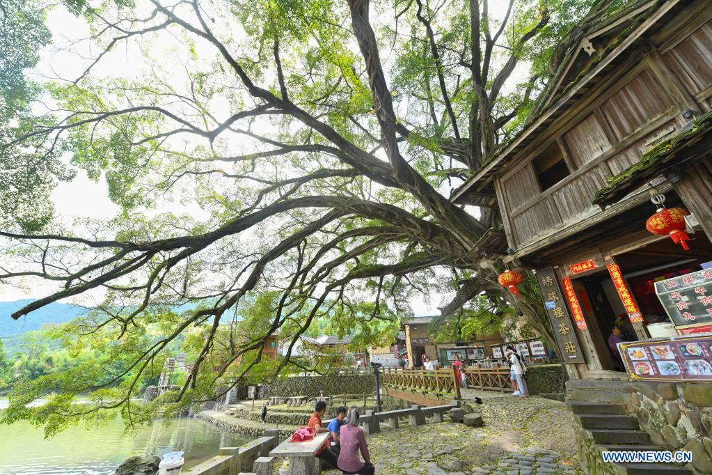 The local villagers rest by the roadside in Yunshuiyao ancient town in Nanjing County, southeast China's Fujian Province, Aug. 17, 2021. Relying on Tulou, the unique residential architecture of Fujian Province which was inscribed on the UNESCO's World Heritage List in 2008, Nanjing County has found a sustainable way to develop the rural tourism industry and boost the local economy. (Xinhua/Song Weiwei)