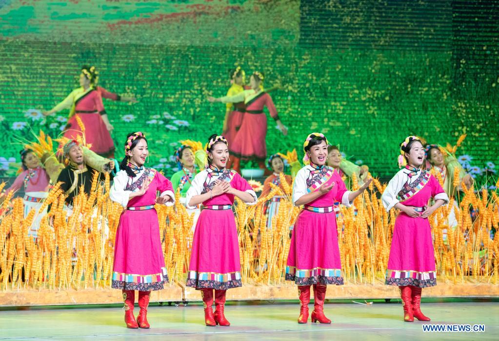 A grand gala is held in celebration of the 70th anniversary of the peaceful liberation of Tibet, in Lhasa, capital of southwest China's Tibet Autonomous Region, Aug. 19, 2021. (Xinhua/Zhai Jianlan)