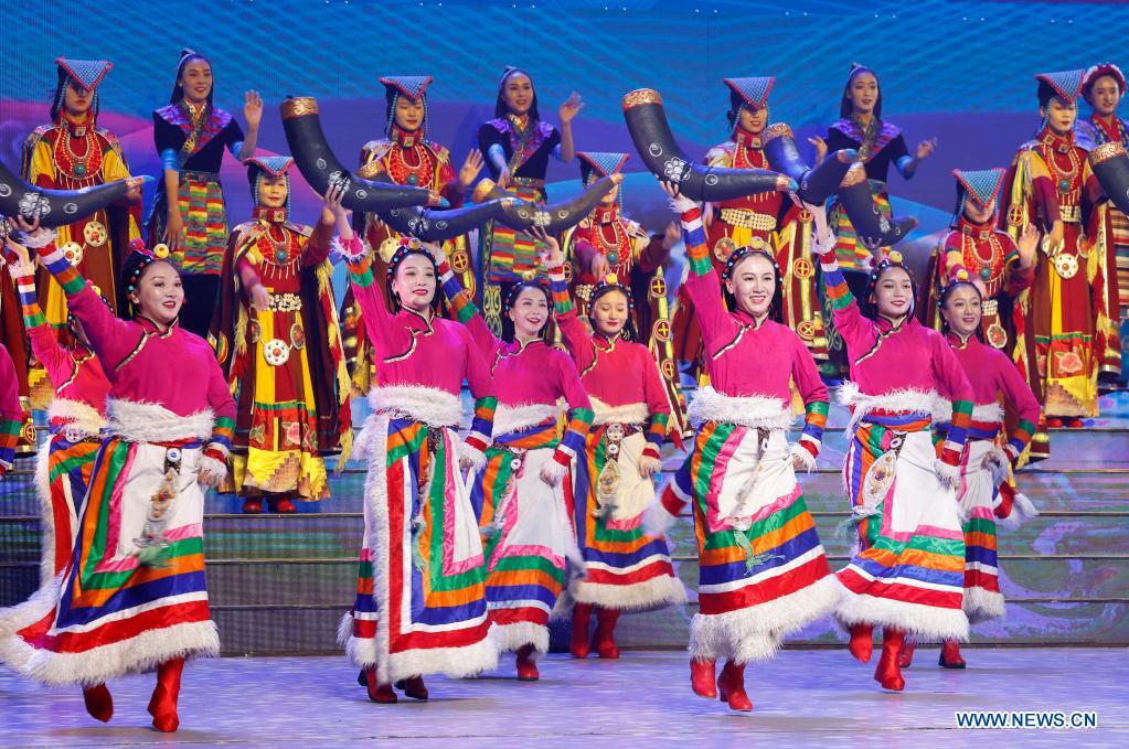 A grand gala is held in celebration of the 70th anniversary of the peaceful liberation of Tibet, in Lhasa, capital of southwest China's Tibet Autonomous Region, Aug. 19, 2021. (Xinhua/Huang Jingwen)