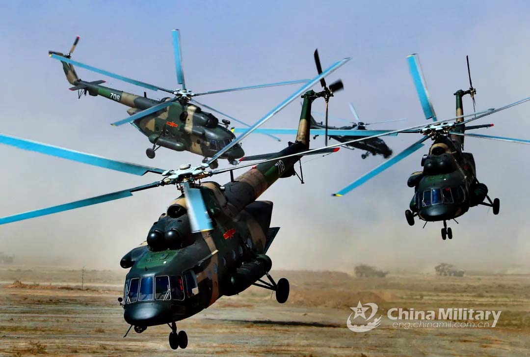 Transport helicopters fly at an extremely-low altitude before landing in the China-Russia joint military exercise ZAPAD/INTERACTION-2021 at a training base of the PLA Army in Qingtongxia City of West China's Ningxia Hui Autonomous Region from August 9 to 13, 2021. (eng.chinamil.com.cn/Photo by Wang Weidong)